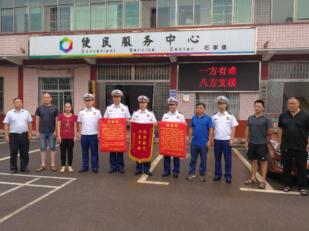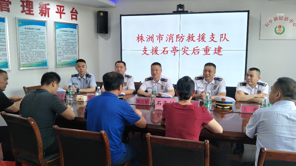 在前段时间的抗洪救灾中,株洲市消防救援支队接到通知第一时间赶到石亭进行救援,挽救了39个受灾群众的生命,转移群众450余人,并一次次冒着生命危险开冲锋舟向被困群众投放物资,为石亭镇抗洪救灾工作作出了重大贡献。在灾后重建的重要时刻,又为石亭送来了大量物资,为石亭灾后重建提供了重要保障。政委黄立军表示,石亭的灾后重建压力很大,如果镇上有需要,株洲市消防救援支队将尽最大努力帮助石亭。