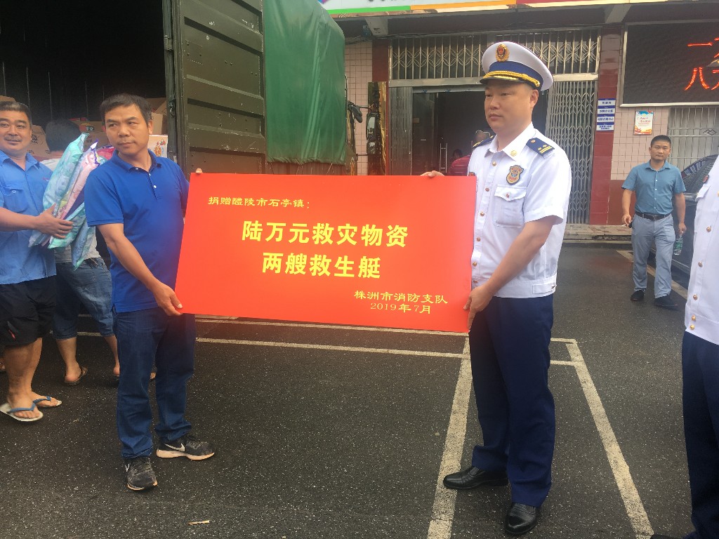 7月18日下午,株洲市消防救援支队赶赴石亭,为石亭镇送来了陆万元救灾物资和两艘救生艇。