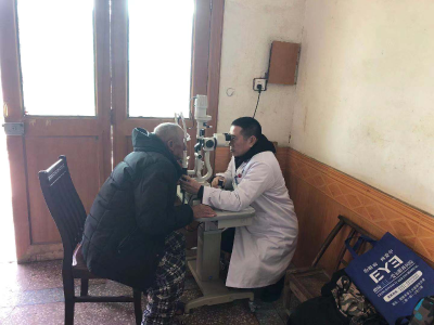 经过仔细询问,现场为老人做视力筛查,仔细检查眼压、眼底,并做裂隙灯检查,初步确定老人为双眼白内障,并约定本周内安排免费手术治疗。