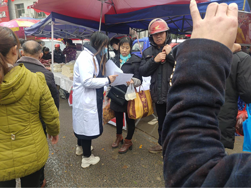 宣传人员通过发放宣传单和现场讲解的方式,向群众普及新型冠状病毒感染的肺炎疫情防治知识,内容包含新型冠状病毒感染的肺炎的定义、临床表现、预防措施等。同时督促农贸市场做好清扫,经营户加强消毒通风,提醒民众去人口密集处要带好口罩。
