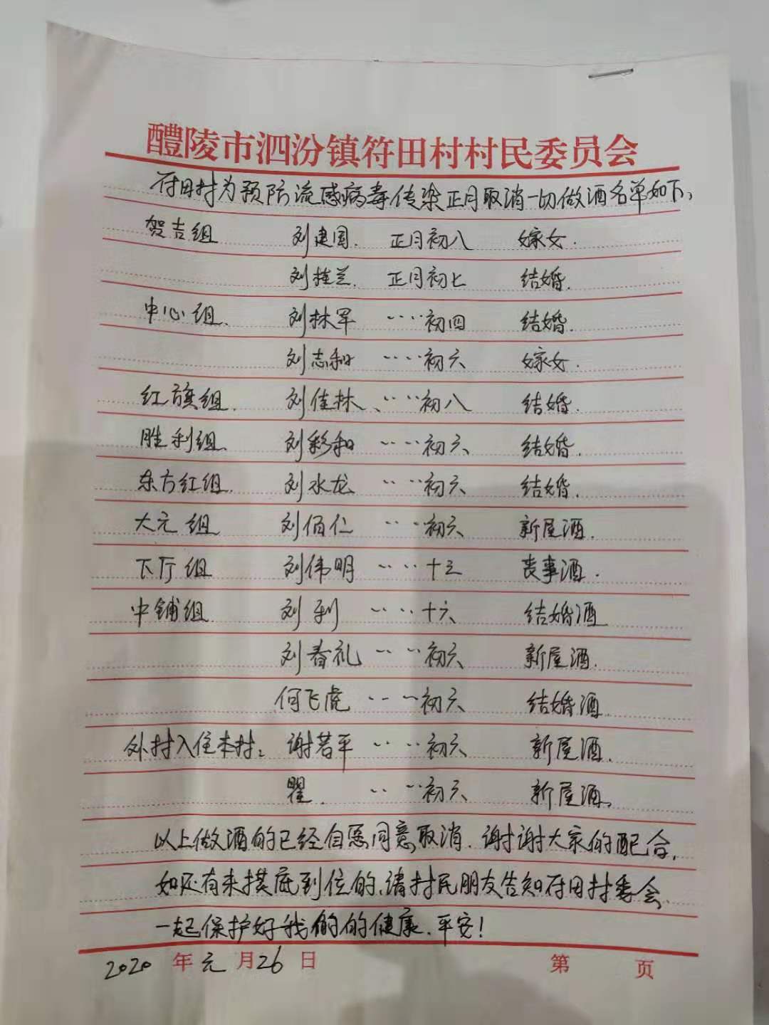 (摸排全镇红白喜事情况,并严格要求延期举办。)
