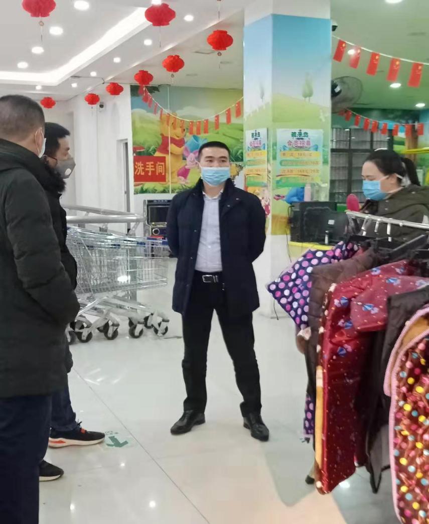 (泗汾镇党委书记宋恒带领班子成员视察集镇超市、宾馆等重点区域,督促全镇人口密集场所暂时关闭落实情况。)