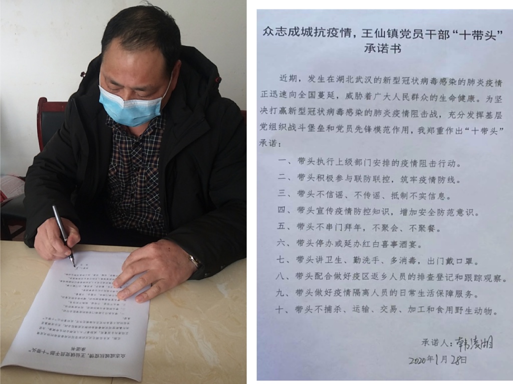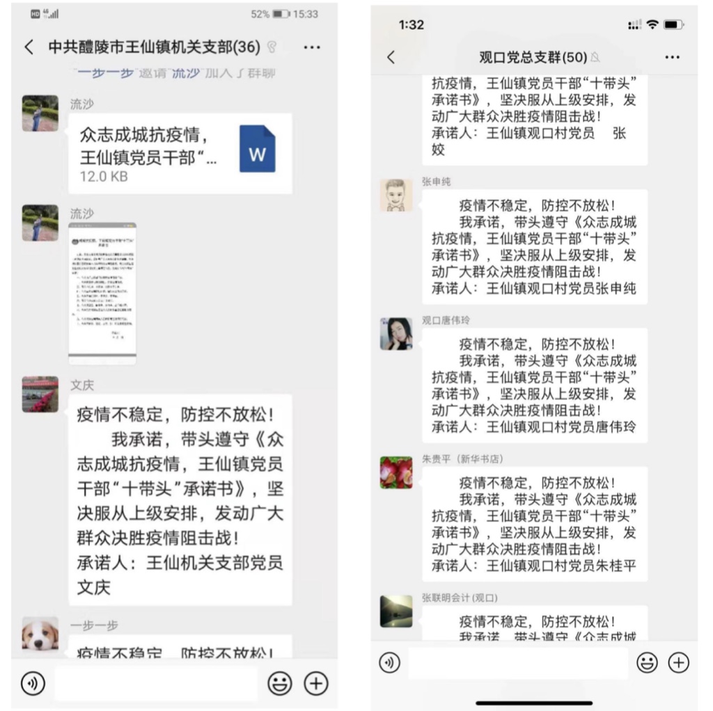 1月28日,在王仙镇每一个基层党组织微信群、每个幸福株洲醴陵王仙微信群和王仙镇党员干部的朋友圈中,随处可以看到这样的一段话:“疫情不稳定,防控不放松!我承诺,带头遵守《众志成城抗疫情,王仙镇党员干部“十带头”承诺书》,坚决服从上级安排,发动广大群众决胜疫情阻击战! 承诺人:王仙xx支部党员xx”。