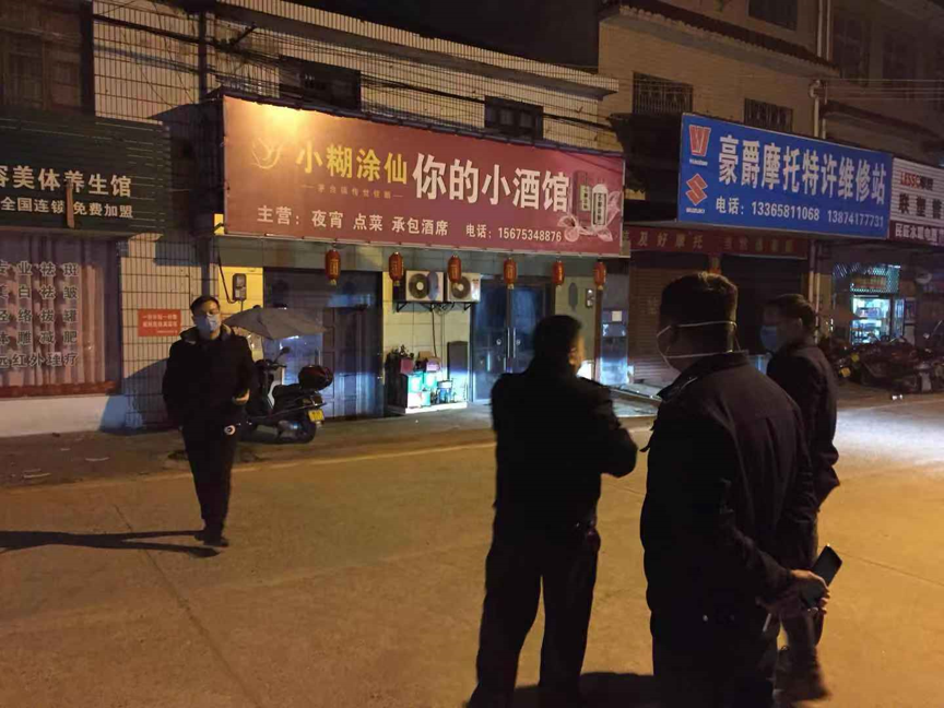 巡查发现,棋牌室均已停业,夜市餐馆基本上已经闭门停业,唯有传统酒家一家夜市店内亮灯,没有关门,询问店主后得知饭店并没有营业,核实店内情况以后,巡查人员将疫情防控期间严禁夜市餐馆营业的调令再次对店主进行了重申,店主也承诺遵守停业调令,遵守“十不准”相关要求。