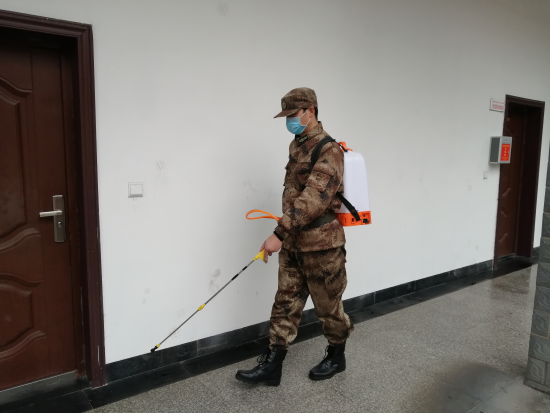 在人员较多的公共场所,嘉树民兵背起喷雾器,将紧缺的消毒液喷洒到威胁群众健康各个角落,累计消毒8万㎡,从环境上筑起疫情防护墙。