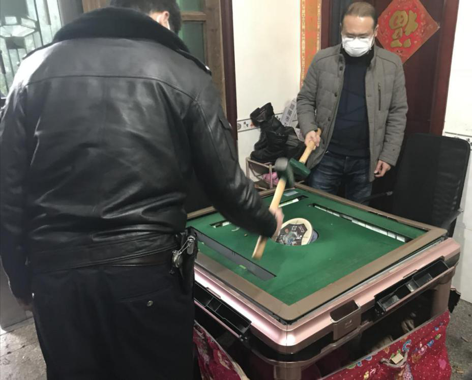 2月6日下午,左权镇疫情防控指挥部接到群众举报:“XX村XX组有人在聚众打麻将。”左权镇党委副书记胡广立即组织镇村两级干部、派出所干警赶赴现场,发现屋内确实有人在打麻将,且室内空间较小,空气流通性差,病菌很容易传播。工作人员立即对麻将馆负责人及参与人员进行了严肃批评教育,并当场用锤子砸毁麻将机,以此警示不听劝阻聚众打牌的村民。