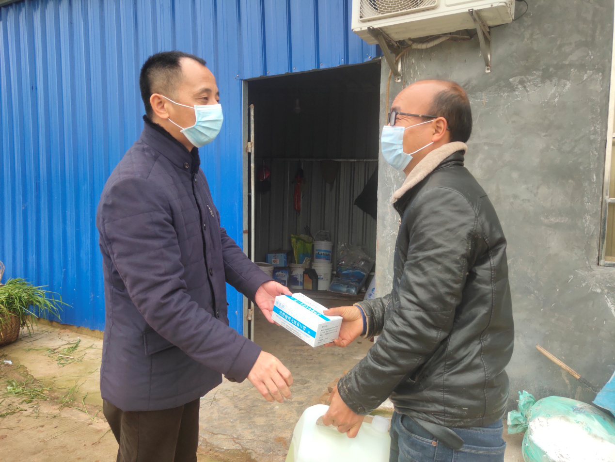 (图:东富镇党委书记陈朝科给东富寺生态农业有限公司送防疫物资)