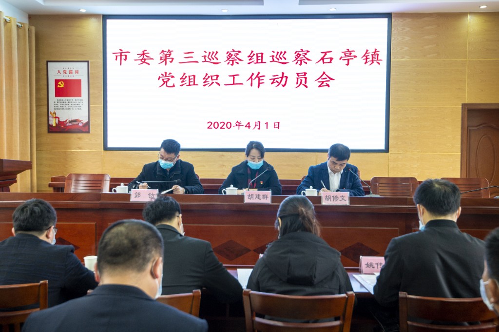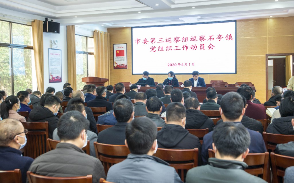 4月1日上午,市委第三巡察组巡察石亭镇党组织工作动员会在石亭镇召开。市委第三巡察组全体成员,石亭镇全体机关干部,离退休干部代表,各村总支书记、村主任,驻镇单位负责人共计80人参加会议。