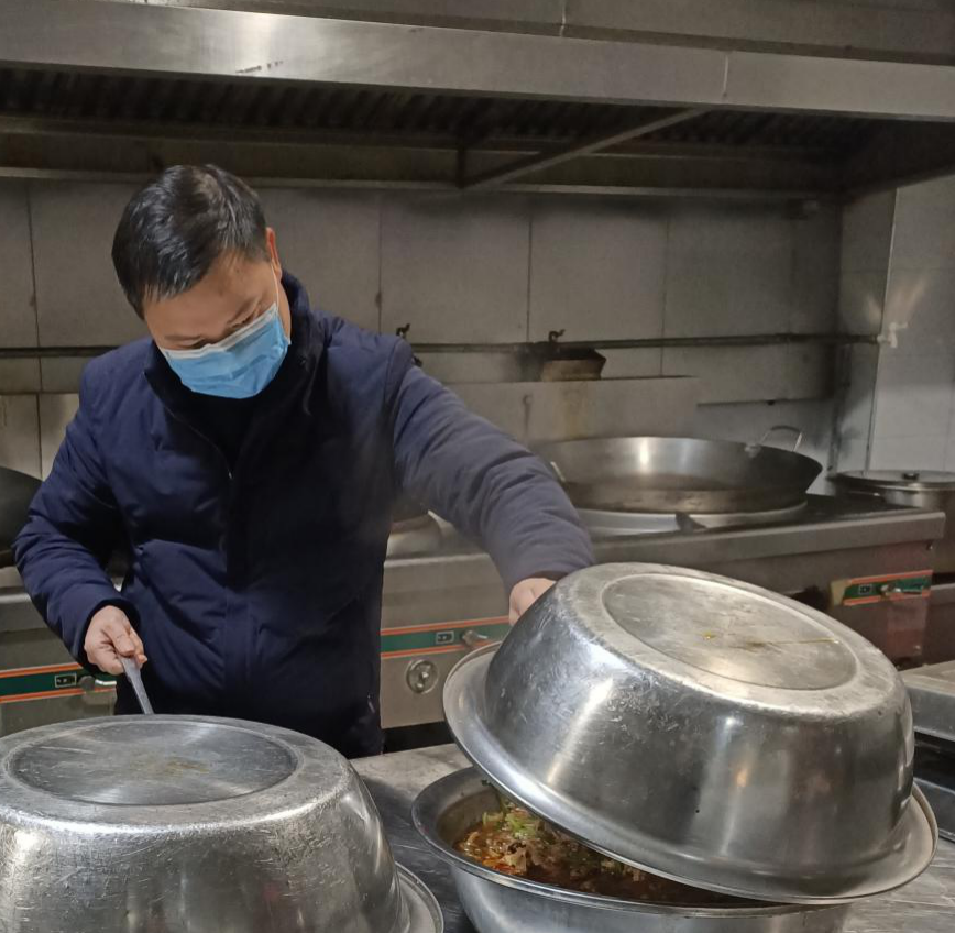 在学校食堂,唐江华详细询问了学校食堂疫情防控管理情况以及在菜品溯源等方面采取的措施,并仔细检查了食堂菜品。