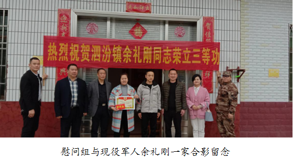 慰问组一行赶到泗汾镇枧上社区余礼刚家时,恰逢余礼刚休假在家,余礼刚妻子表示会继续支持老公以饱满的热情投身祖国的国防事业。余礼刚本人也表示,感谢镇党委政府的关心,以后会继续努力、再创佳绩、再立新功,以回报祖国、回报部队、回报家乡人民的厚爱。