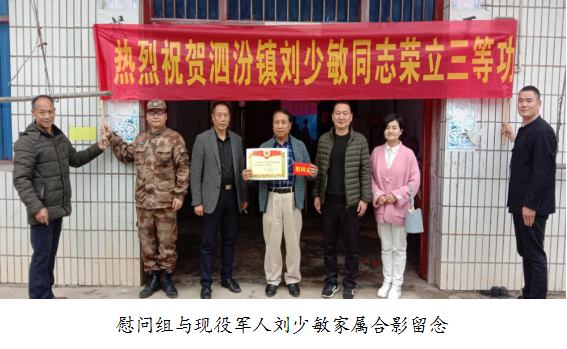 现役军人刘少敏家住泗汾镇符田村,在阵阵喜庆的鞭炮声中,慰问组一行人将立功喜报、证书和奖章送到刘少敏父亲手中,对刘少敏荣立三等功表示祝贺。刘少敏父亲表示,对儿子在部队的表现感到欣慰,感谢部队的培养和地方政府的关心。