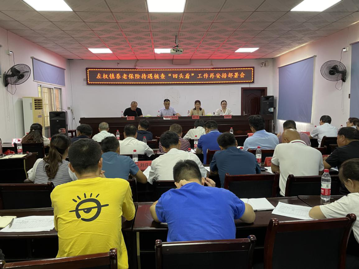 7月22日上午,左权镇召开养老保险待遇核查“回头看”工作再安排部署会。镇领导班子,全体机关干部,各村(社区)党组织书记,板杉派出所和辖区农商行相关负责人共计60余人参会。会议由镇党委书记唐尚昆主持。