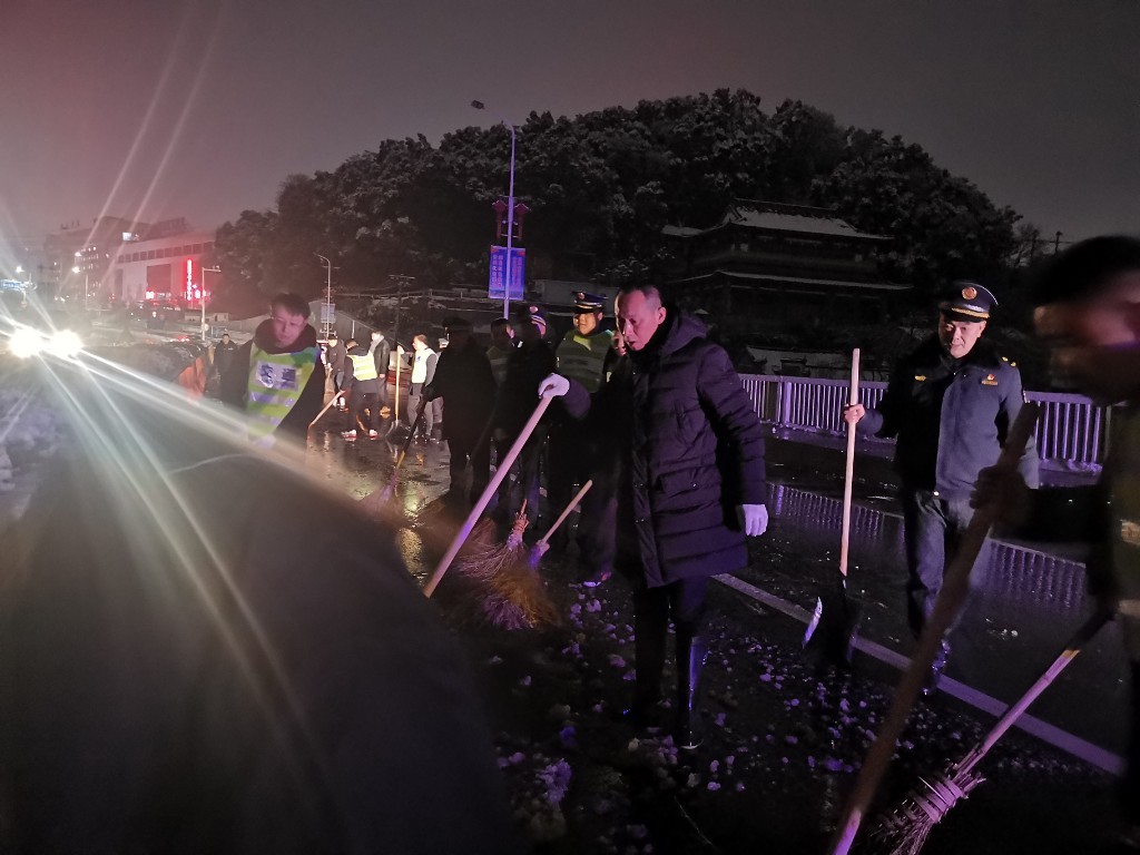 以最快的速度,清扫道路积雪。夜幕、清晨,街道冰雪卫士在默默行动。醴陵大桥是全市关键交通路段,考虑到大雪将导致桥面结冰,书记、主任亲自上阵,带领40名机关干部,凌晨奋战4个小时,用一把把铲子、一个个扫把将积雪清扫,恢复路面整洁。清晨,400多名机关、村(社区)干部、志愿者响应集结令奋战在雨雪清扫第一线,将辖区桥梁、陡坡、机关单位进出口等重要路段清扫干净,确保交通通畅、百姓出行安全。
