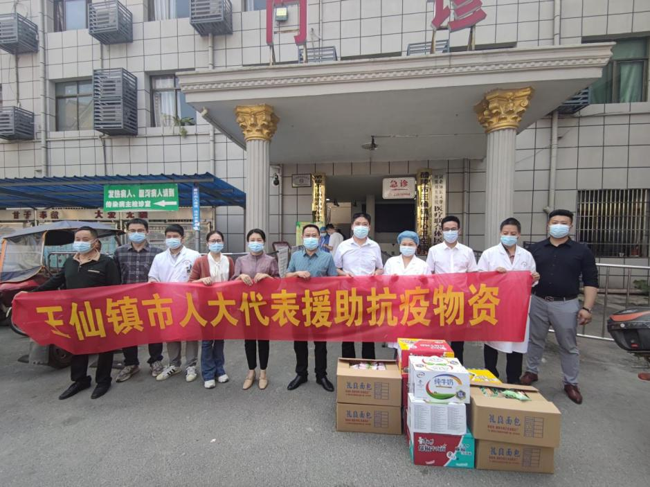 4月12日,市镇两级人大代表来到镇卫生院、防疫卡点捐赠物资,助力疫情防控。捐赠物资包括防护服、方便面、面包、矿泉水等。一份捐赠一份心,代表们以自己的方式向医务人员、村(社区)工作者、志愿者等表达了关切和敬意。