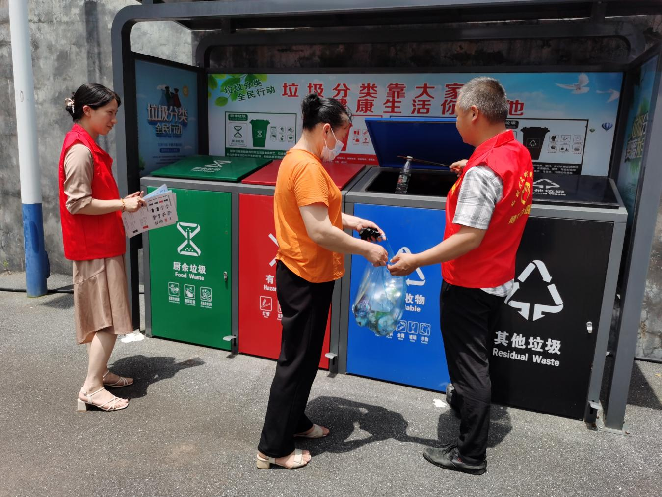 “张姐,请将生活垃圾分类投放。”每天7点至8点和19点至20点两个时间段,志愿者分别在综合服务中心、村民活动广场、安置区等多个垃圾分类投放点位参与“守桶”工作。通过礼貌的提示、规范的动作、专业的分类,“桶边”指导村民规范分类、正确投放。对没有按要求分类的村民现场耐心指导二次分类,有效提高村民垃圾分类辨别的能力。