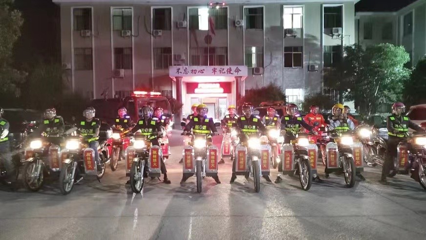 “车队车队,请报告巡逻情况”“平安”,镇政府工作人员正拿着对讲机了解摩托车队巡逻情况。