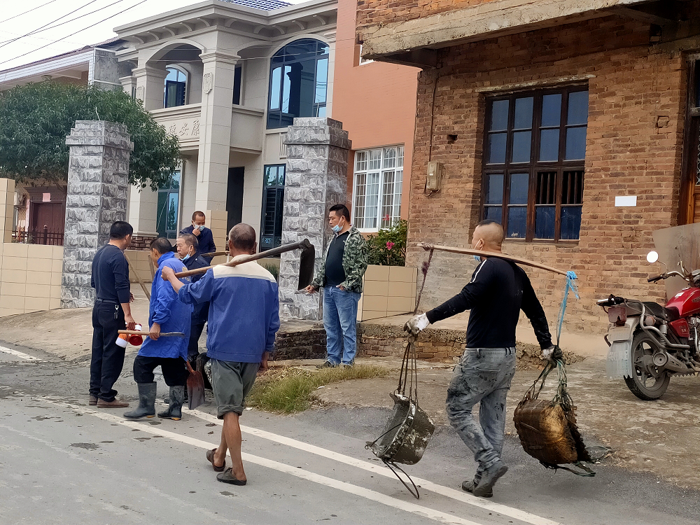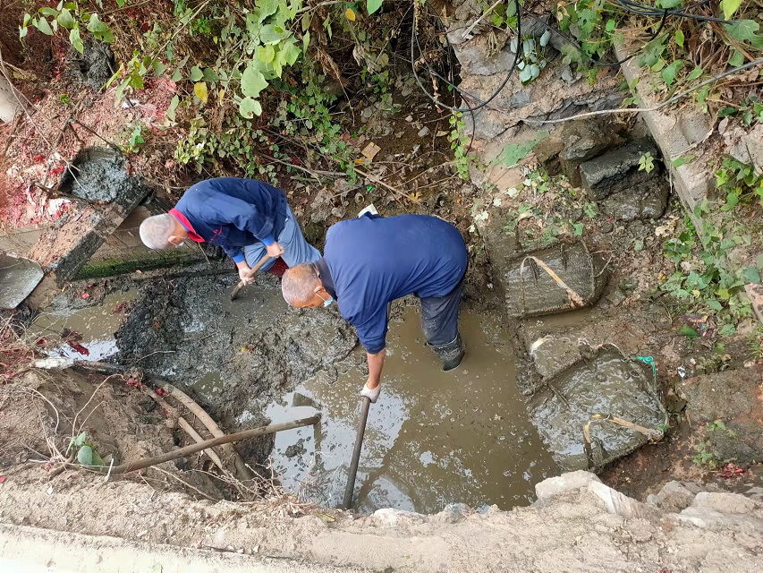 在清淤过程中,众人分工有序、协力配合,有的穿着水鞋、拿着铁锹站在水渠之中铲除沟渠内的淤泥、水草;有的拿着手电筒躬身在暗黑的涵洞中打捞杂物;有的担着簸箕、水桶将垃圾有序运送;有的举起锄头清理水渠河道旁边的枯枝败叶,并将零散丢弃在各处的生活垃圾、农业生产垃圾一一钳出。