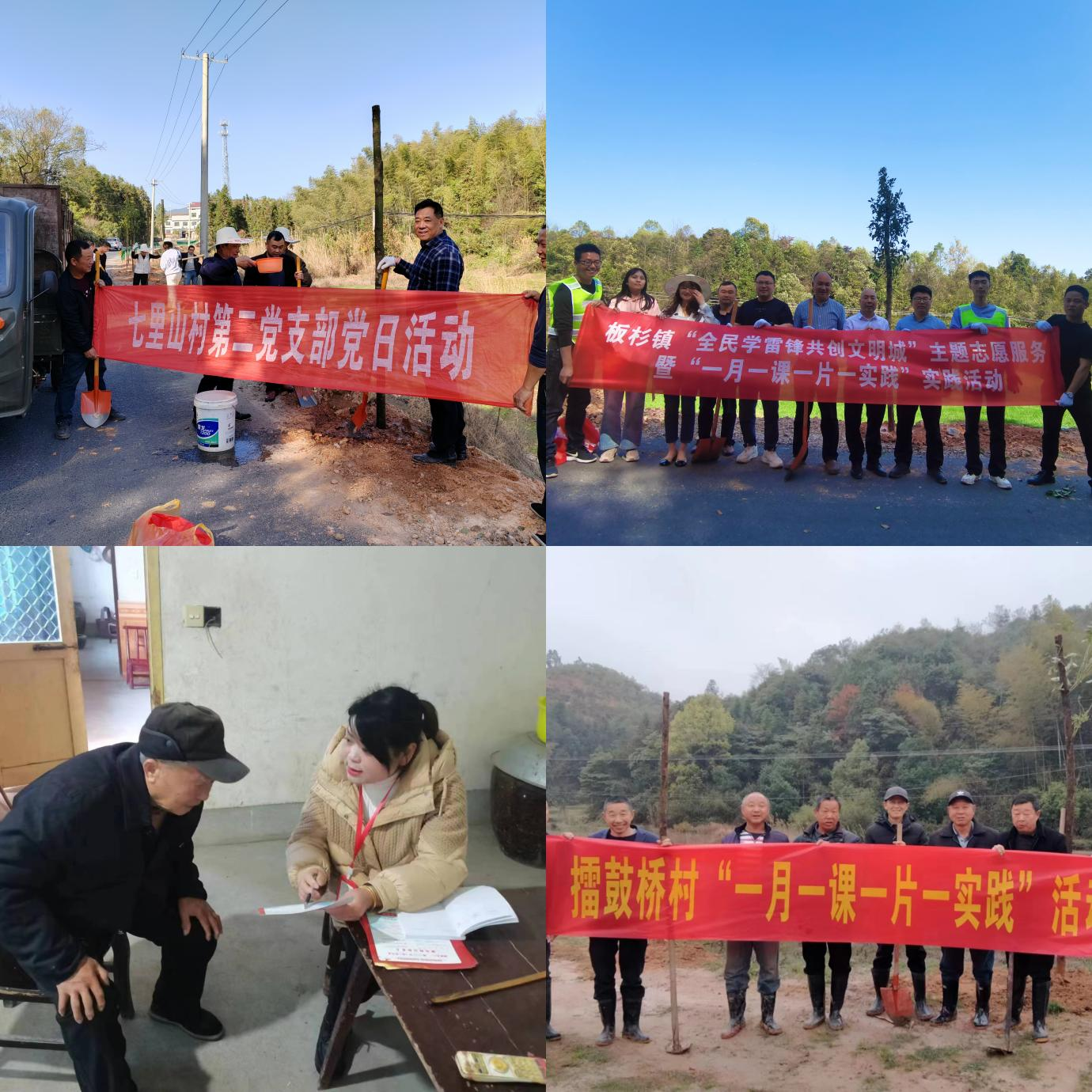板杉镇将“一月一课一片一实践”活动与中心工作相结合开展“微服务”,打通服务群众“最后一米”。支部党员们在醴官线沿线开展义务植树活动,以“板杉绿”点亮和美乡村;在医保征缴阶段,主动上门,一对一重点告知,耐心细致向村民讲解医保政策,劝告其按时续保;积极投身春耕备耕工作,帮助农户做好育秧大棚搭建、农资储备、农机管护等工作;森林防火关键期,穿上红马甲,骑着摩托车,穿行在村前村后宣传禁火政策....在推动基层治理、服务民生中彰显担当。同时,结合“村(居)民代表联系服务群众”工作,开展走访慰问,各支部党员走村入户,开展政策宣讲、沟通了解问题、着力化解矛盾,每季度召集1次“民情恳谈会”,重点围绕区域内公共服务设施建设、矛盾隐患化解等开展民主议事,进一步强化了党组织的为民导向,形成“服务不缺位、矛盾不上交”的共建格局。自活动开展以来,全镇各村党支部共开展实践活动30余次,走访服务群众8000余人次,在真学真干中增强党性修养、提升能力素质。