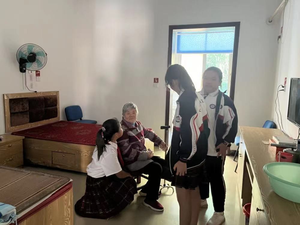 在老师的带领下,同学们迈着整齐的步伐唱着响亮的歌曲来到了东富镇敬老院,参观了老人们居住的地方,与敬老院的爷爷奶奶们亲切交谈,分享趣事,聆听老人的心声。