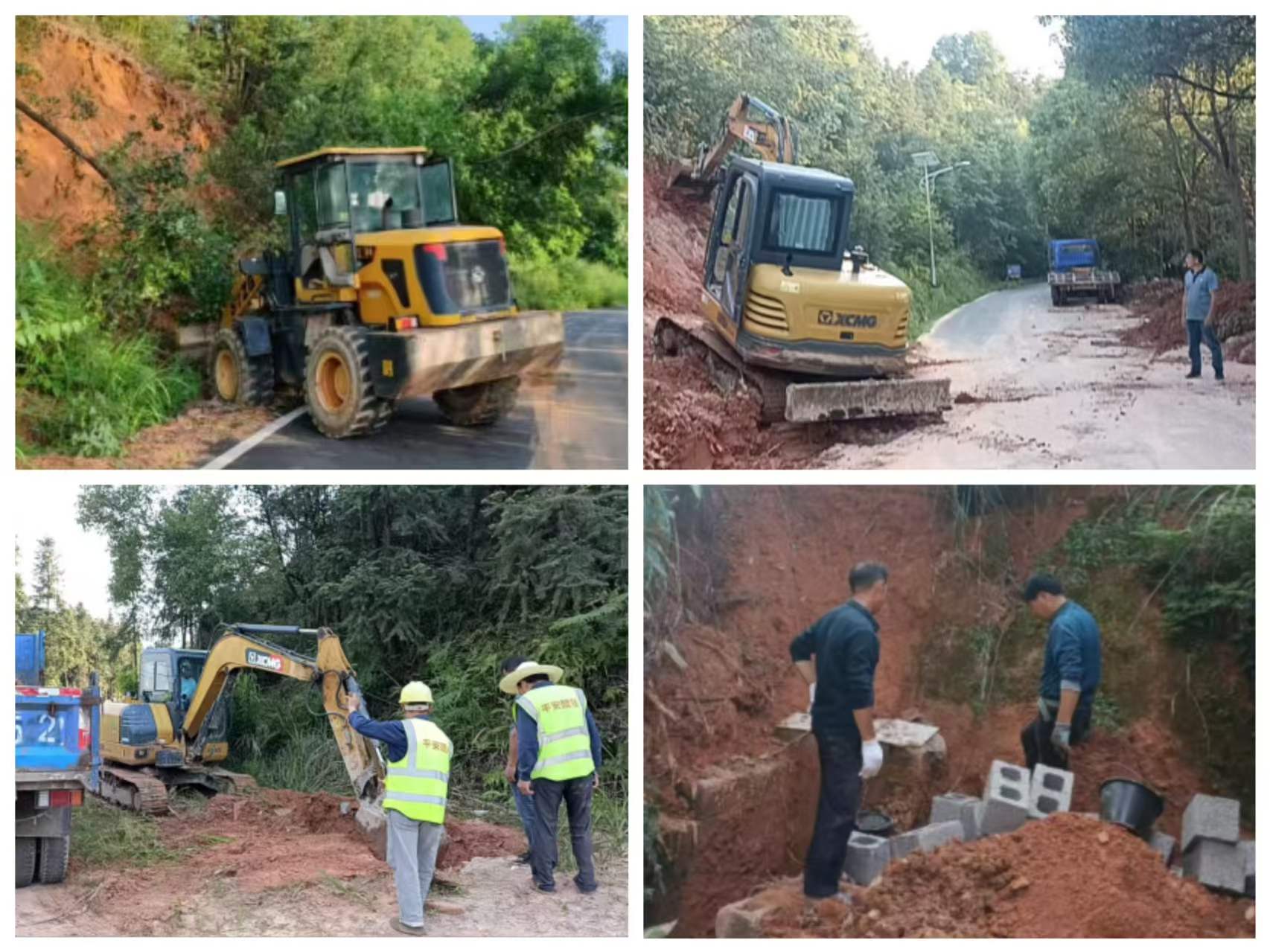 排查过程中,工作人员逐一前往新阳村、花桥村、石羊村等地质灾害高风险区域,现场进行初步风险研判。通过拍照记录和标注具体位置,全面摸底潜在地质灾害隐患,实时将影像资料及定位信息收集汇总,详细了解滑坡易发区、高陡边坡区等隐患点的地质状况和周边村民分布情况。针对巡查中发现的危险系数较高的地质隐患点,干部们密切关注雨情、水情变化,及时入户向周边群众发出风险预警,并采取临时管控措施,在各隐患点周边设置醒目标识牌,提醒群众注意避让。针对不同程度的垮塌,镇村工作人员迅速安排专业施工队伍,第一时间修复水毁道路护坡、冲洗清理道路淤泥等,确保群众出行安全。
