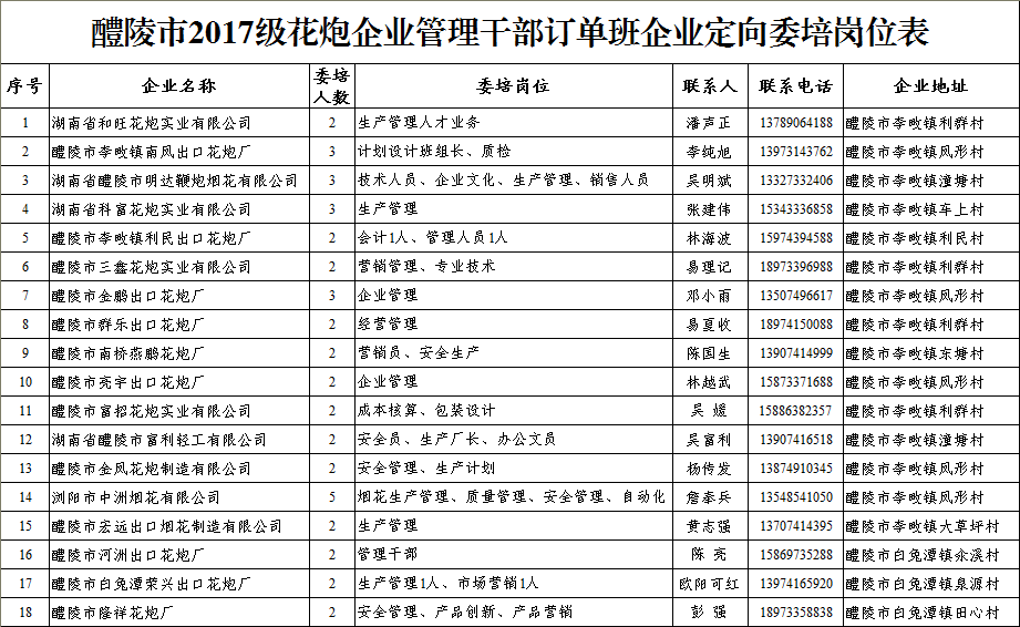 近日,在市安监局、市花炮局和市花炮行业协会等相关单位的鼎力支持下,各花炮企业积极申报,我校完成了2017级花炮企业管理干部订单班企业定向委培岗位表。现予以发布。