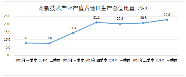 当前醴陵市高新技术产业增加值完成93.8亿元,占地区生产总值比重达22.8%,同比提高8.4个百分点,较一季度提高2.5个百分点,对全市经济发展的直接贡献率达到29.3%。高新技术产业产值完达到218.2亿元,占规模以上工业产值比重达到39.8%,同比提高15.5个百分点。从季度趋势来看,自2016年一季度开始,高新技术产业增加值占地区生产总值比重在稳步上升,由2016年一季度来翻了2.85倍,高新技术产业发展对全市经济发展的驱动作用进一步增强。高新技术产品增加值占地区生产总值比重具体趋势如下图: