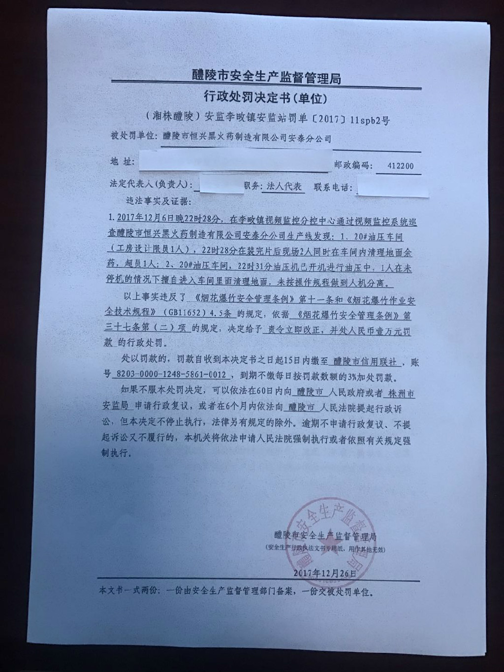 (湘株醴陵)安监李畋镇安监站罚单[2017]llspb2号