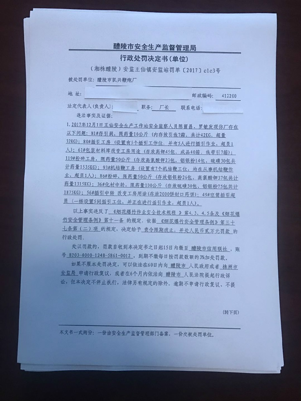 (湘株醴陵)安监王仙镇安监站罚单[2017]clc3号