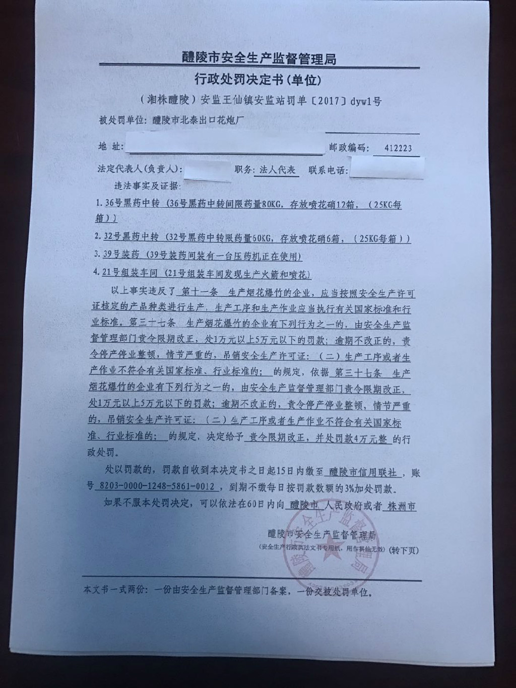 (湘株醴陵)安监王仙镇安监局罚单[2017]dyw1号