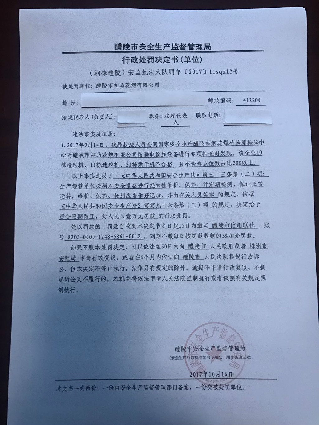 (湘株醴陵)安监执法大队罚单[2017]llsqz12号