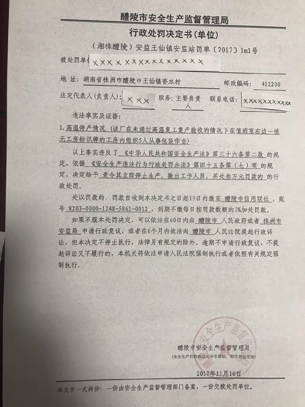 (湘株醴陵)安监王仙镇安监站罚单[2017]lm1号