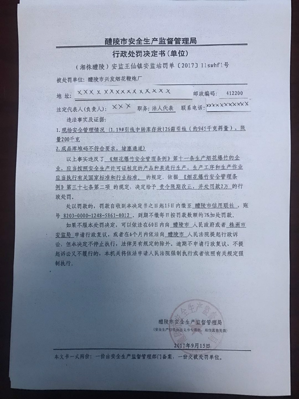 (湘株醴陵)安监王仙镇安监站罚单[2017]llswhf1号