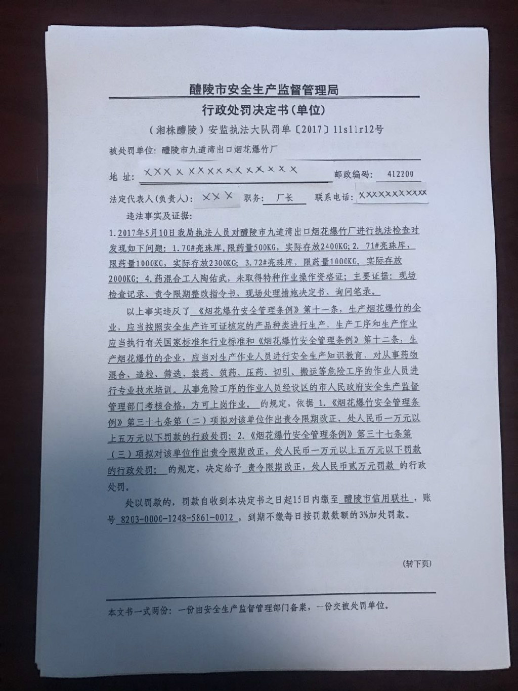 (湘株醴陵)安监执法大队罚单[2017]llsllr12号