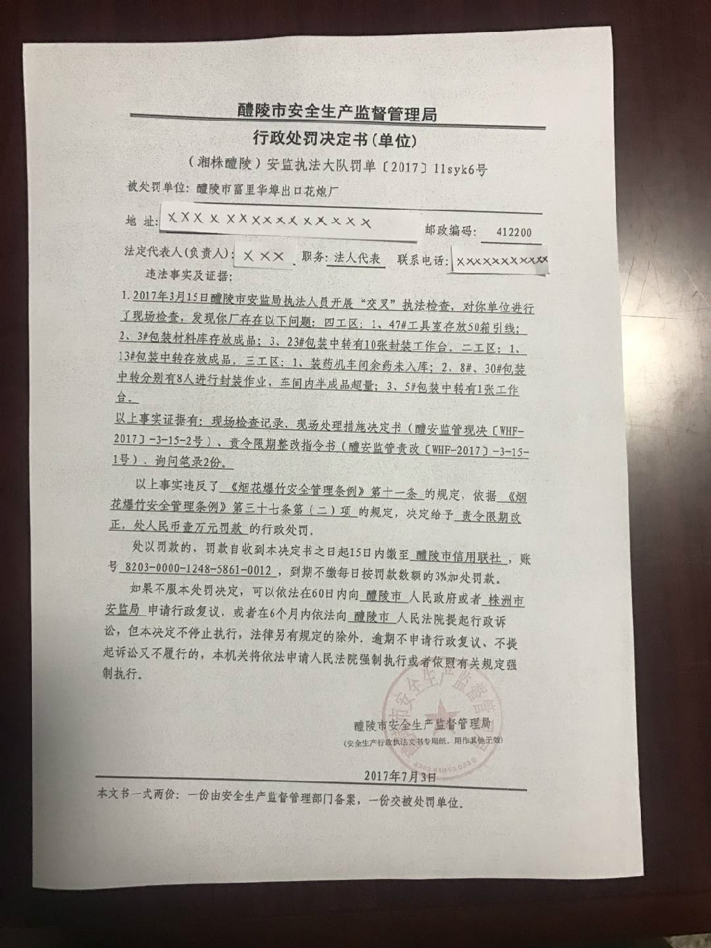 (湘株醴陵)安监执法大队罚单〔2017〕llsyk6号