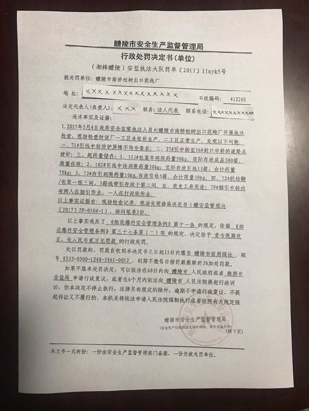 (湘株醴陵)安监执法大队罚单〔2017〕llsyk5号