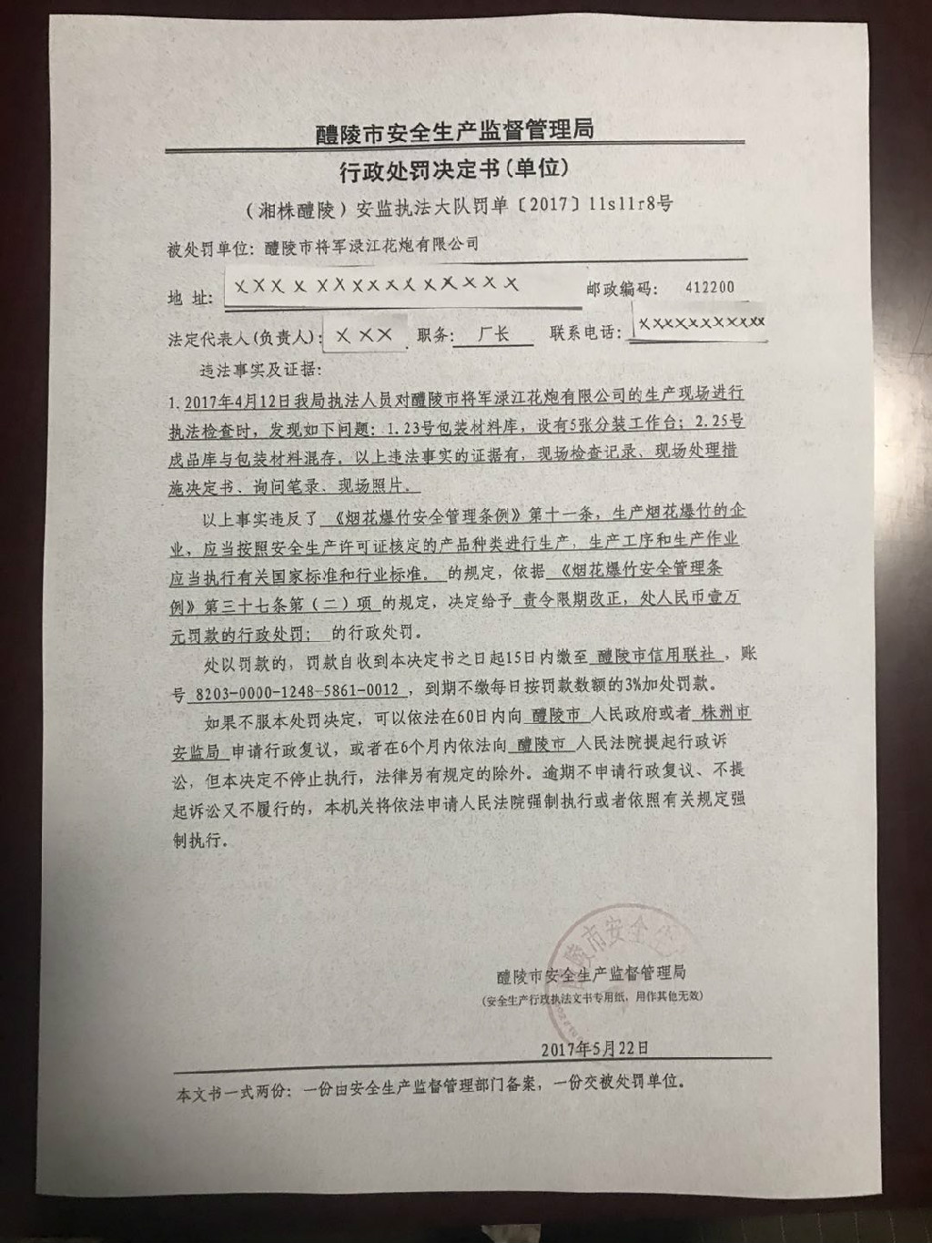 (湘株醴陵)安监执法大队罚单〔2017〕llsllr8号
