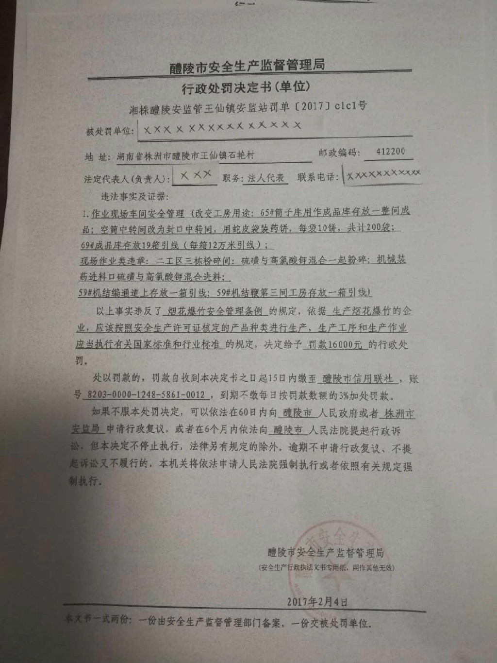 (湘株醴陵)安监王仙镇安监站罚单〔2017〕clc1号
