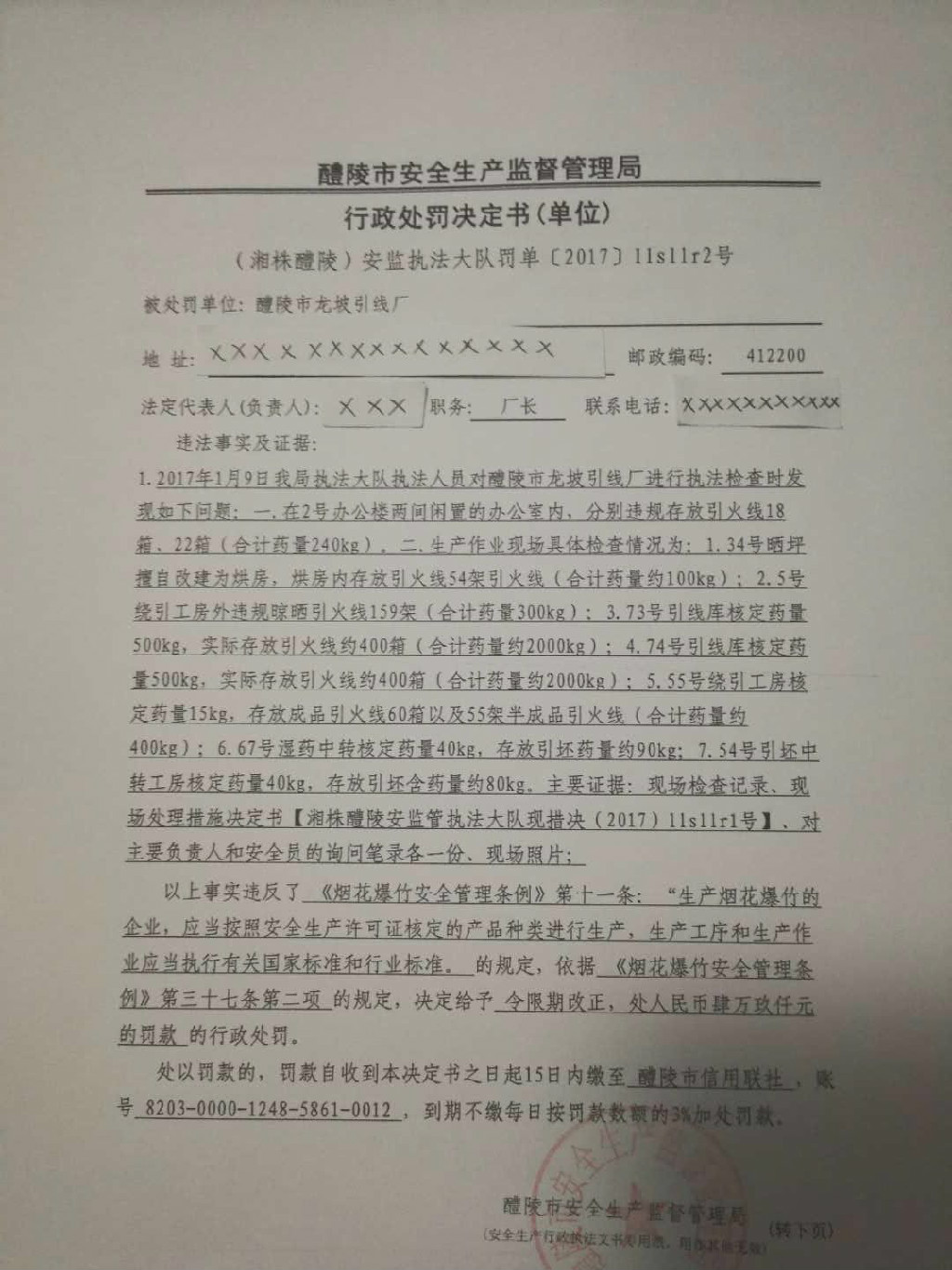 (湘株醴陵)安监执法大队罚单〔2017〕llsllr2号