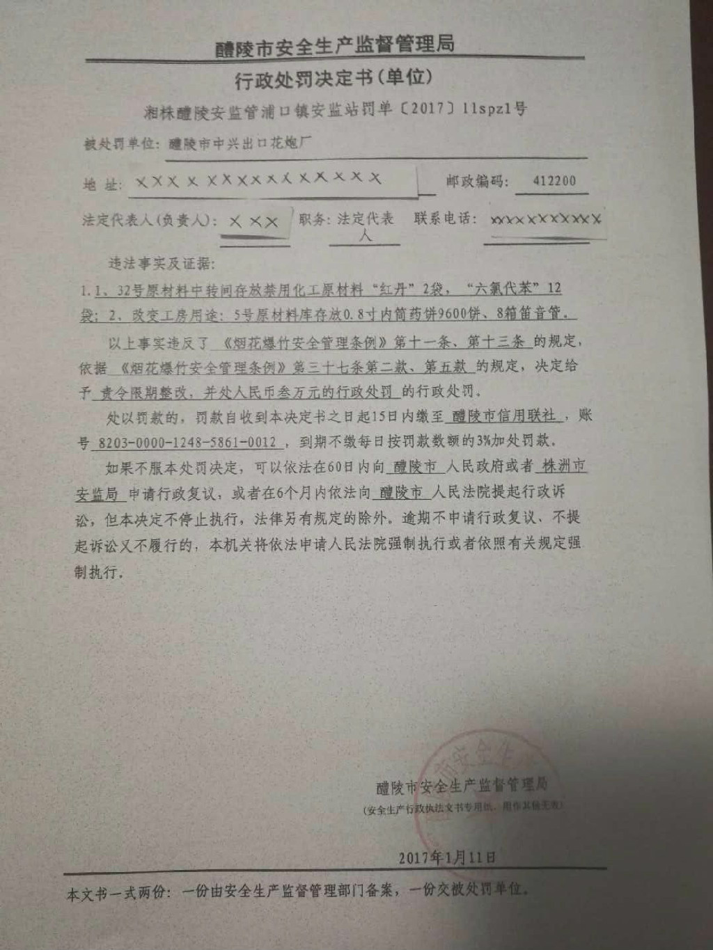 (湘株醴陵)安监浦口镇安监站罚单〔2017〕llspz1号