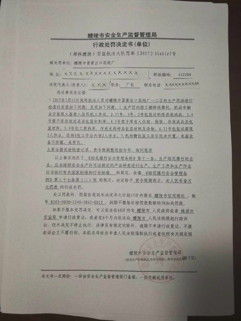 (湘株醴陵)安监执法大队罚单〔2017〕llsllr7号