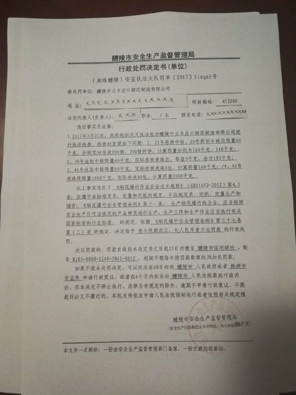 (湘株醴陵)安监执法大队罚单〔2017〕llsqz5号