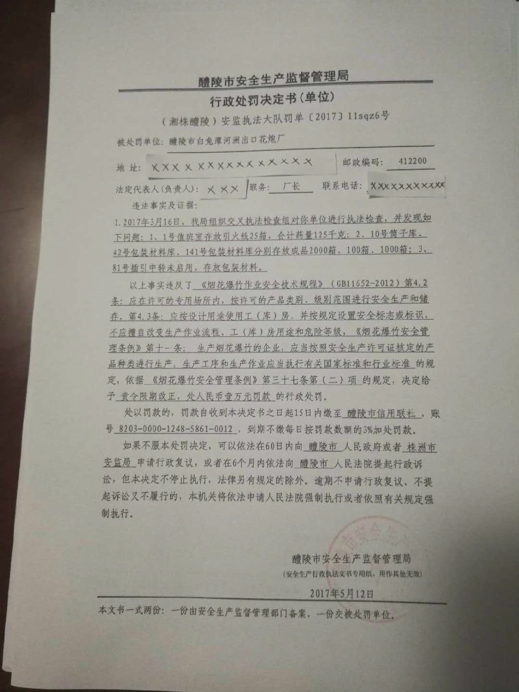 (湘株醴陵)安监执法大队罚单〔2017〕llsqz6号