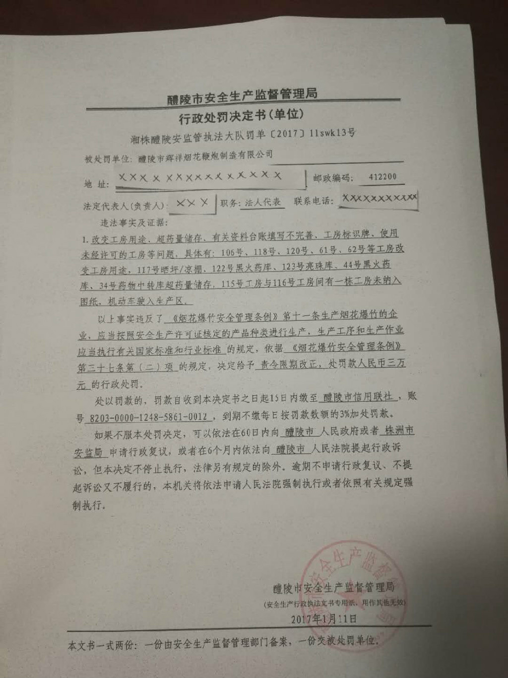 (湘株醴陵)安监执法大队罚单〔2017〕llswkl3号