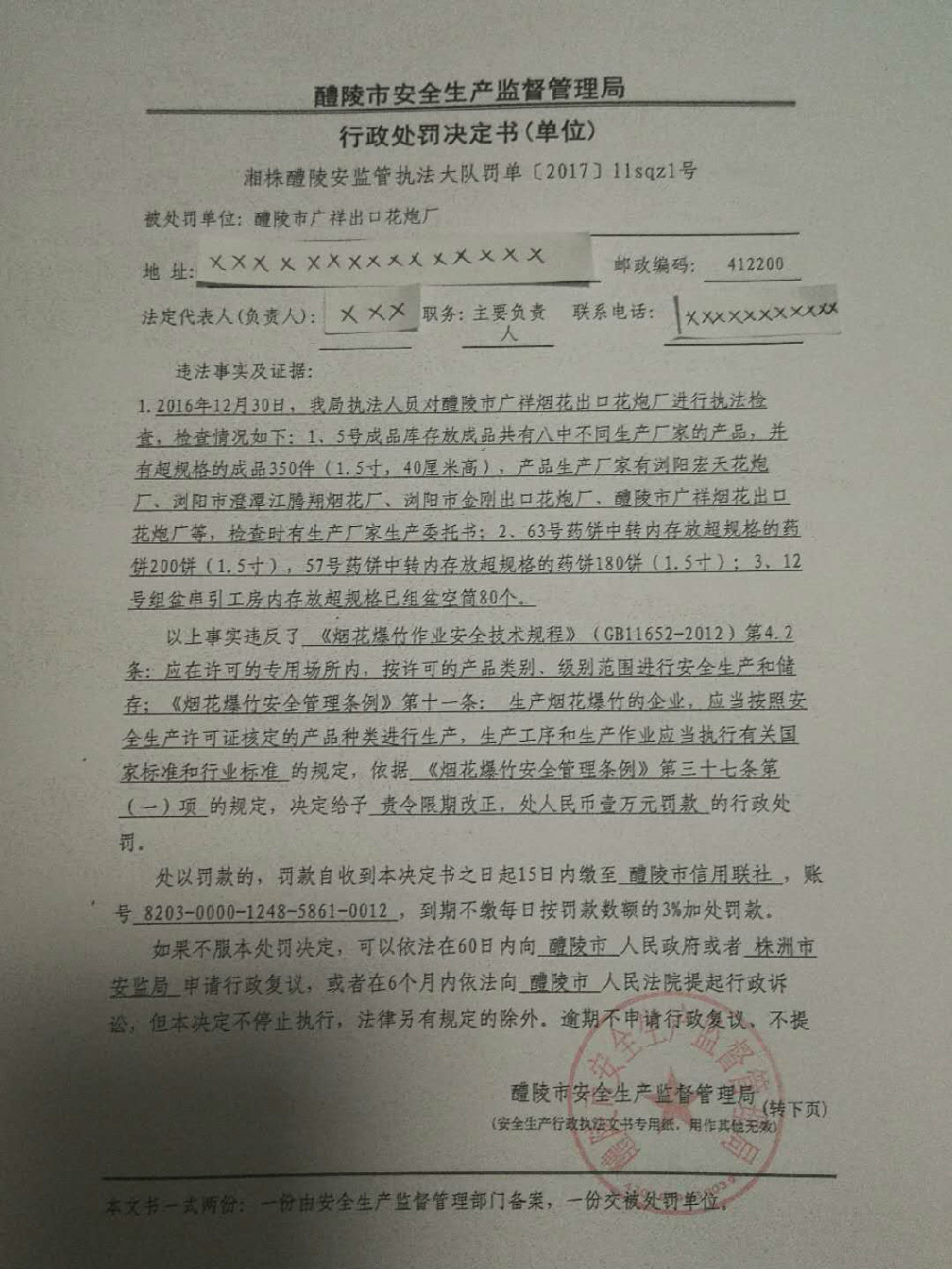 (湘株醴陵)安监执法大队罚单〔2017〕llsqz1号