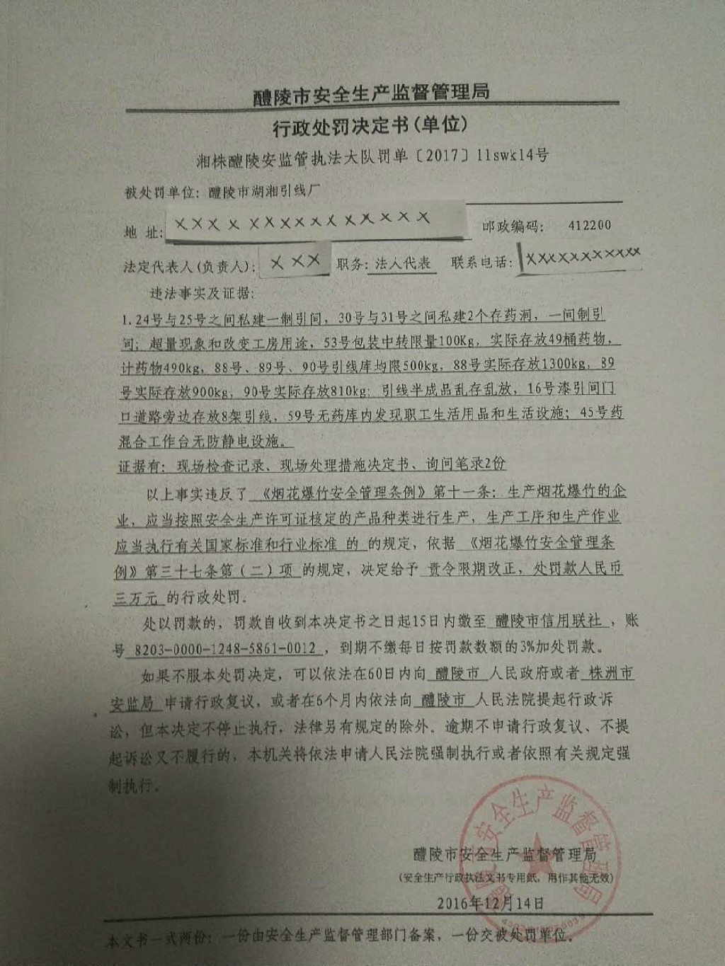 (湘株醴陵)安监执法大队罚单〔2017〕llswkl4号