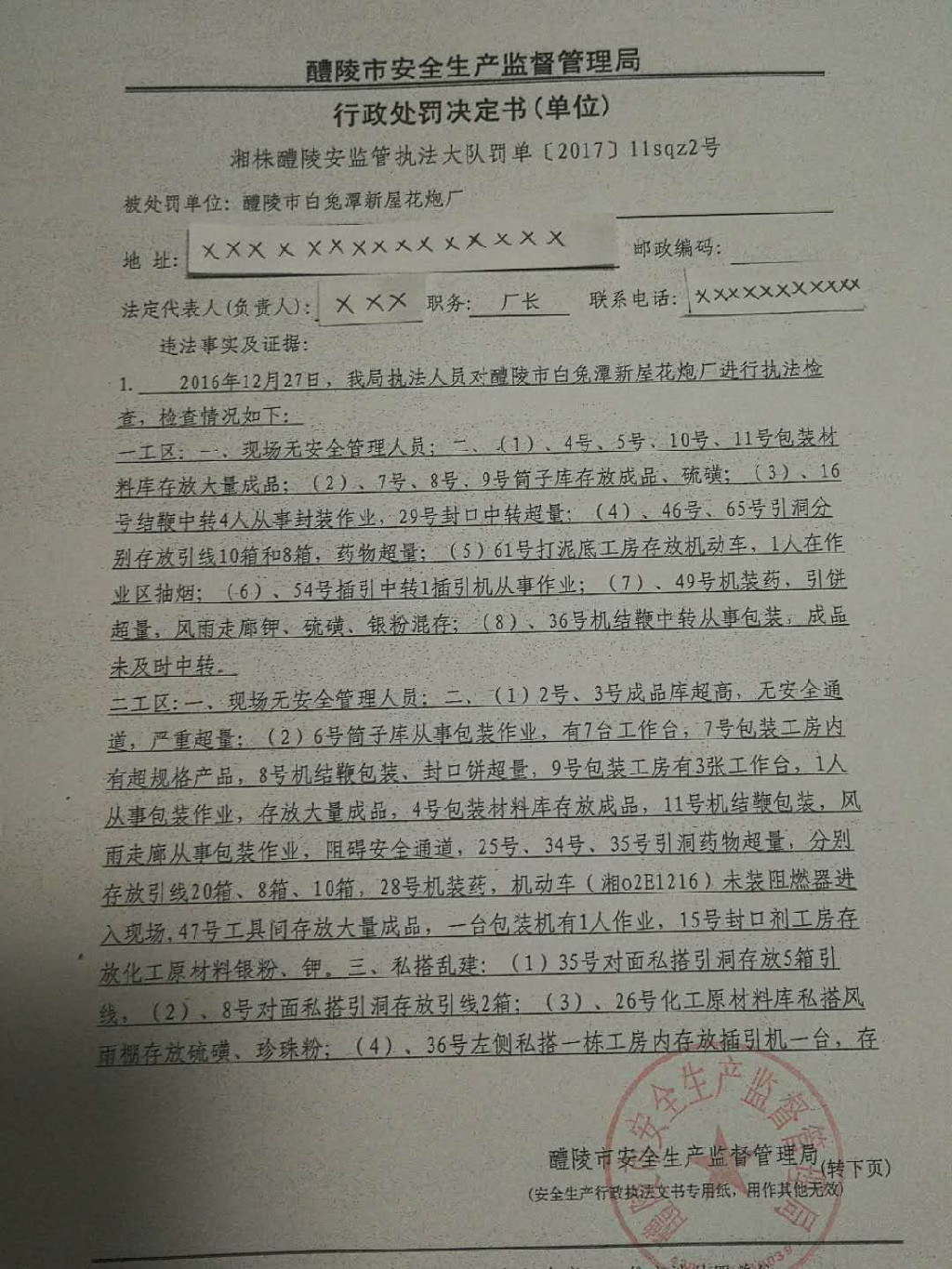 (湘株醴陵)安监执法大队罚单〔2017〕llsqz2号