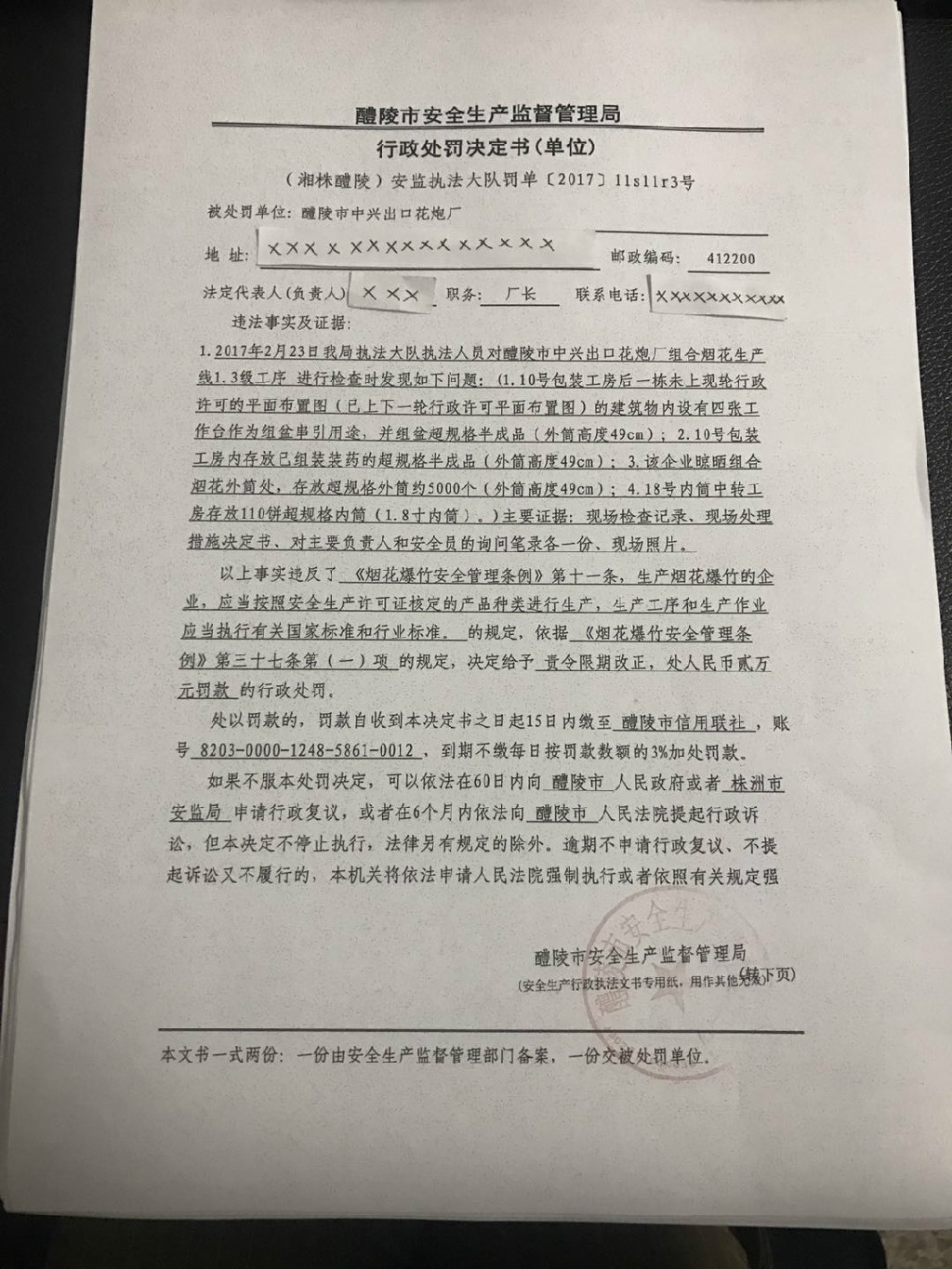 (湘株醴陵)安监执法大队罚单[2018]llsllr3号