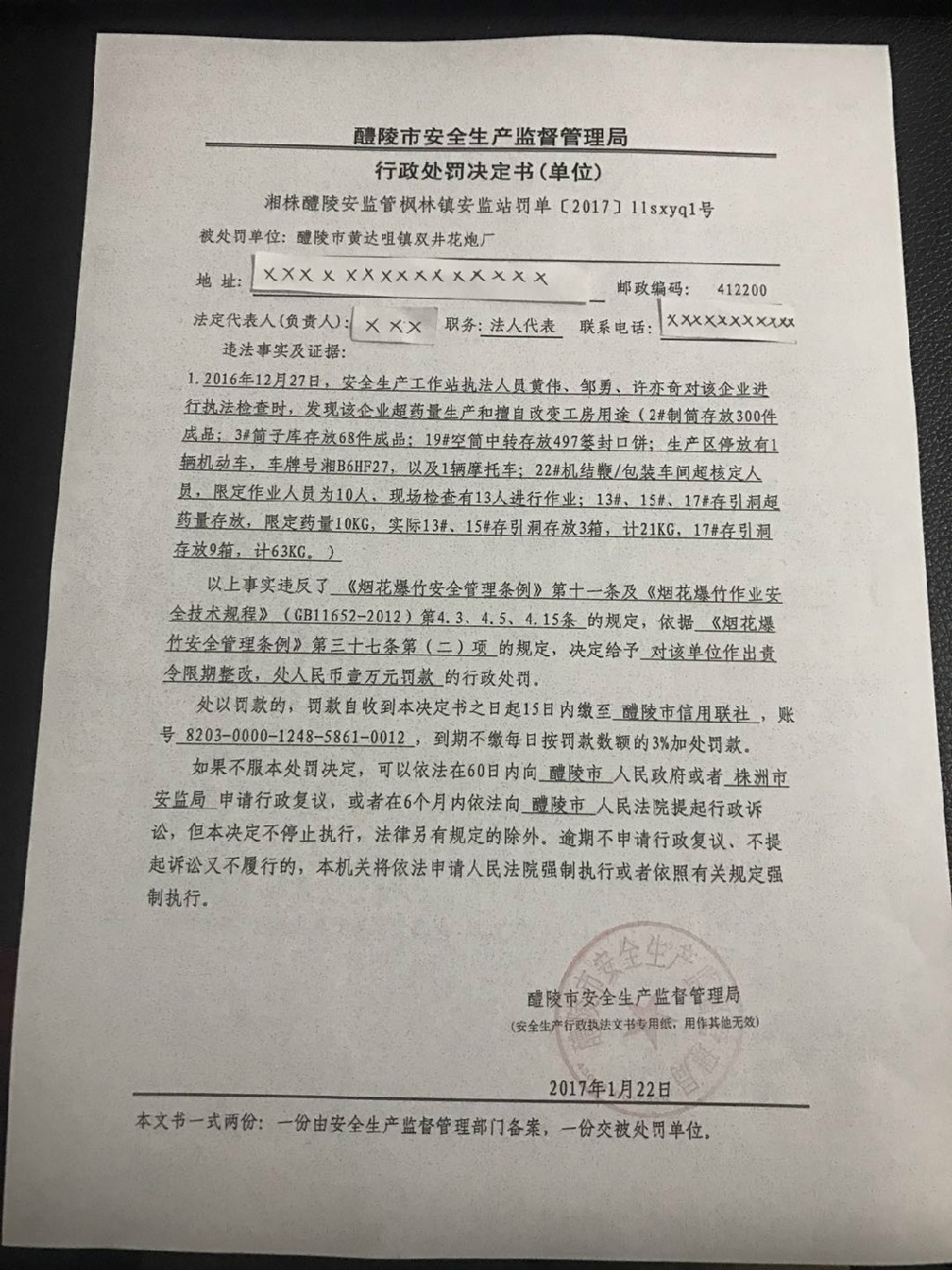 (湘株醴陵)安监枫林镇安监站罚单[2017]llsxyq1号