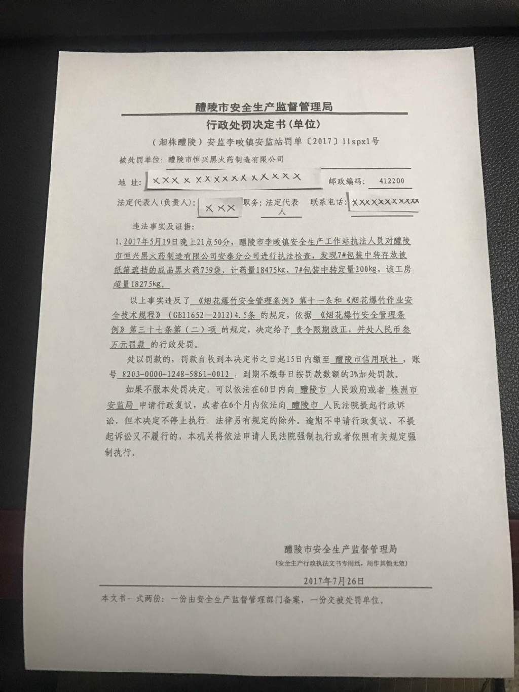 (湘株醴陵)安监李畋镇安监站罚单[2017]llspx1号