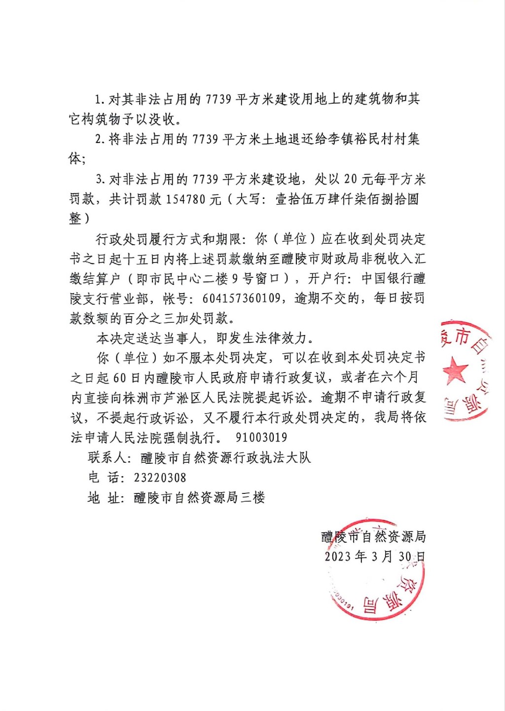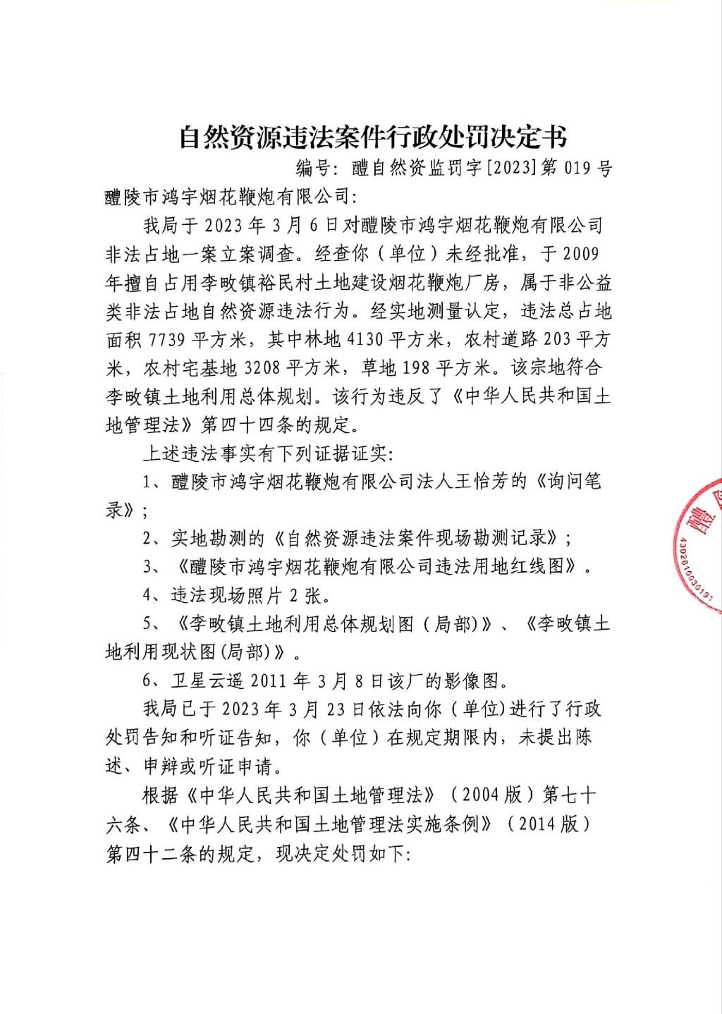自然资源违法案件行政处罚决定书(醴陵市鸿宇烟花鞭炮有限公司)